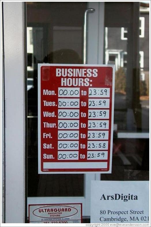 | Location: | Cambridge, MA, USA | | Caption: | Business Hours. | | | | | Size: | large (also available: small | medium) | | Date: | January 2000 | | | | | Camera: | Canon PowerShot Pro 70 |