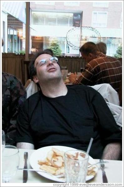 | Location: | Cambridge, MA, USA | | Caption: | ArsDigita Thanksgiving 1999. Philip, too full for dessert. | | | | | Size: | large (also available: small | medium) | | Date: | November 25, 1999 | | | | | Camera: | Canon PowerShot Pro 70 |