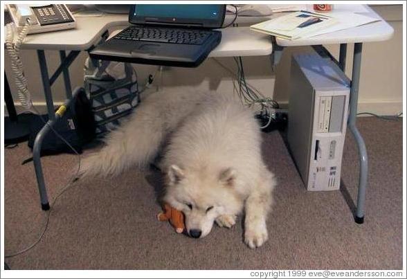 | Home > ArsDigita > ArsDigita Thanksgiving 1999. Alex, resting under Yon's table after playing in the dirt. | |