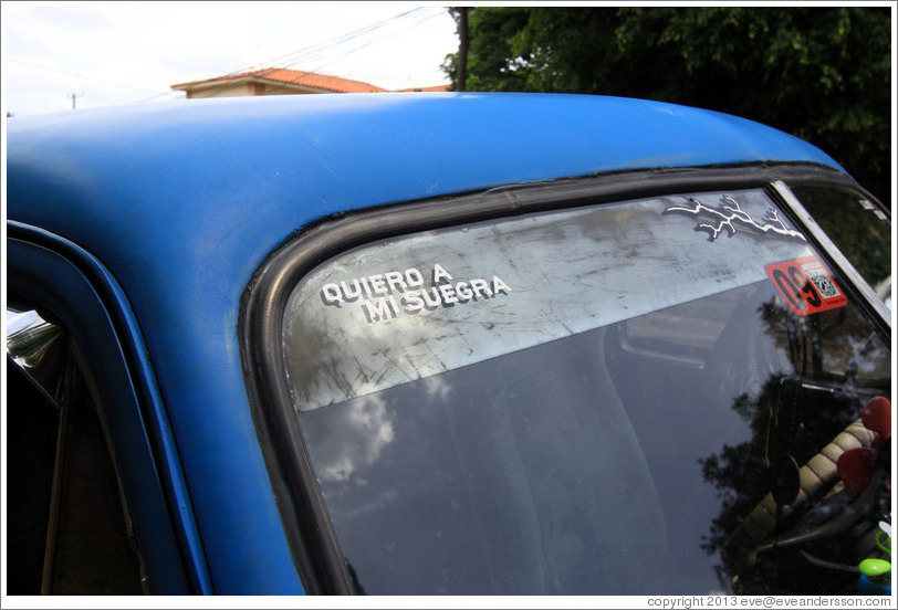 Car with windshield sticker: "Quiero a mi suegra ... lejos de mi."