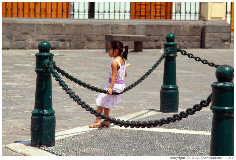 > Girl resting on a chain, Iglesia de San Francisco, Historic Center of Lima.