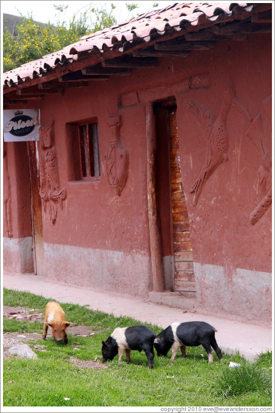 > House near the Puca Pucara ruins, with pigs in front of it.