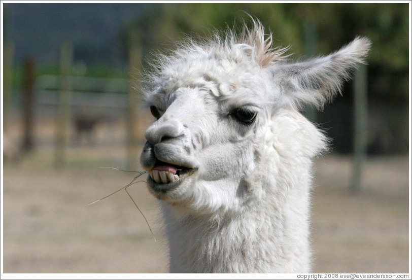 Llama chewing hay on the grounds of Old Faithful Geyser of California.
